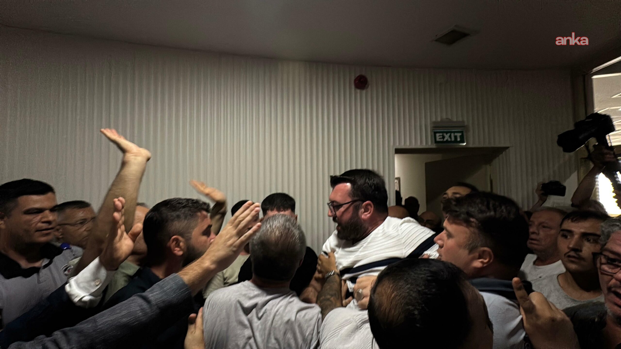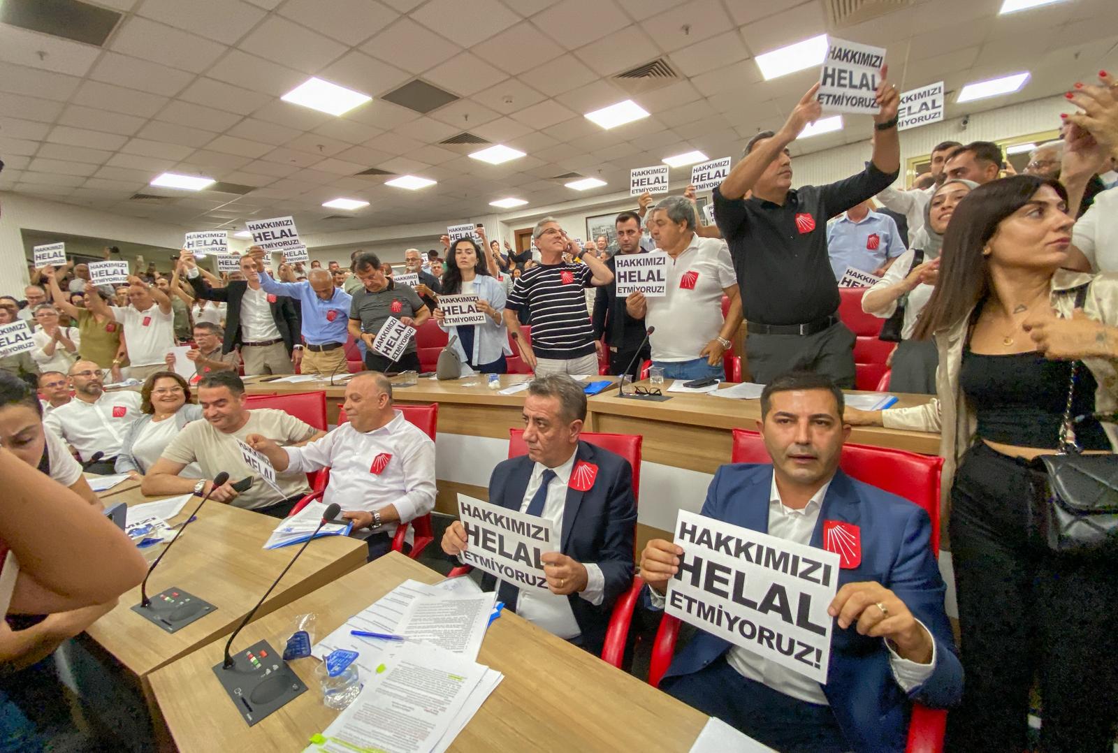 CHP Grubu’nun meclis salonundan çıkışı sırasında ışıklar kapatılarak belediye çalışanı olduğu belirten grubun sloganları devam etti.