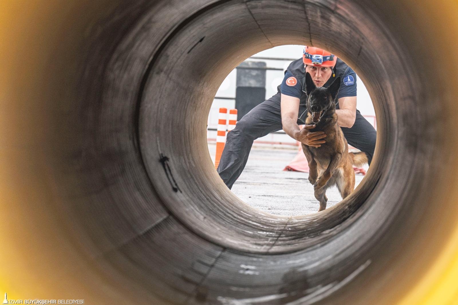 İzmir İtfaiyesi K9 Birimi’nin sahiplendiği Belçika kurdu Momo, arama kurtarma köpeği olmak için eğitim alıyor. Başarılı olursa afetlerde görev yapacak.