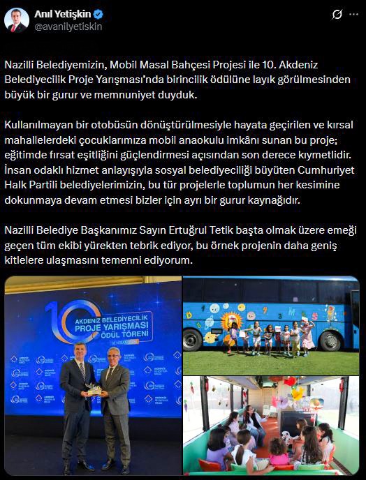 Cumhuriyet Halk Partisi Aydın Büyükşehir Belediyesi Meclisi Grup Başkanvekili ve Efeler Belediye Başkanı Anıl Yetişkin, Nazilli Belediyesi’nin “Mobil Masal Bahçesi” projesinin Antalya’da düzenlenen 10. Akdeniz Belediyecilik Proje Yarışması’nda birincilik ödülü kazanması dolayısıyla tebrik mesajı yayımladı.
