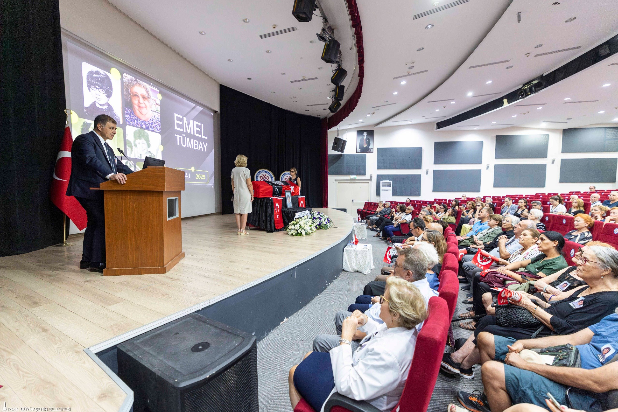 84 yaşında hayatını kaybeden Ege Üniversitesi Tıp Fakültesi Tıbbi Mikrobiyoloji Anabilim Dalı Emekli Öğretim Üyesi Prof. Dr. Emel Tümbay, Ege Üniversitesi Tıp Fakültesi Muhittin Erel Amfisi’nde düzenlenen törenle son yolculuğuna uğurlandı. Ege Üniversitesi Tıp Fakültesi mezunu olan İzmir Büyükşehir Belediye Başkanı Dr. Cemil Tugay da Tümbay’ın öğrencisi olarak törene katıldı. Kürsüye çıkarak hocası ile ilgili anılarını ve düşüncelerini aktaran Başkan Tugay, Tümbay’ın unutulmayacak benzersiz bir hoca ve bilim insanı olduğunu söyledi.