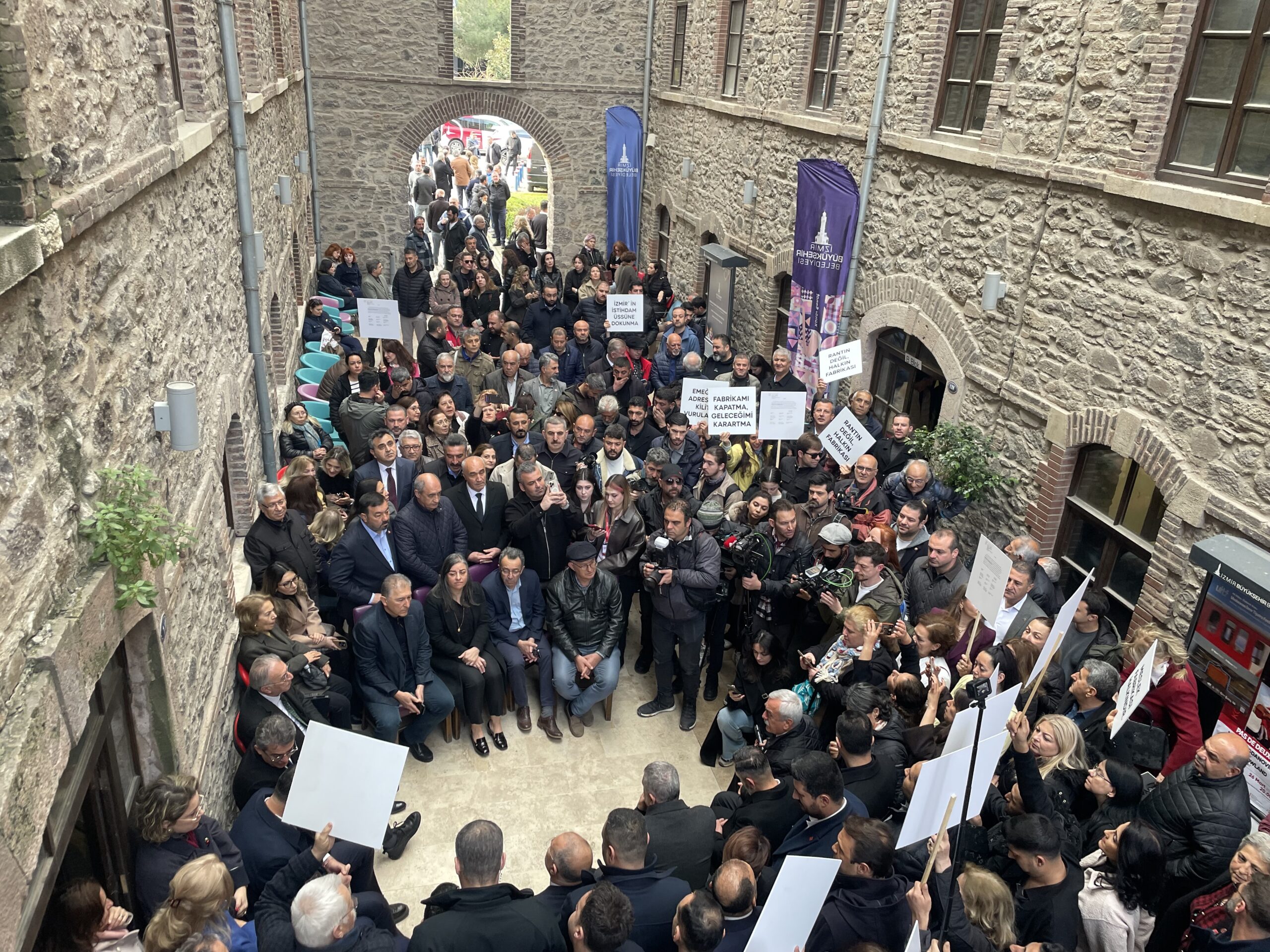Tuğkan ÜSKÜP/ Gazete Pürüz– İzmir Büyükşehir Belediye (İzBB) Başkanı Cemil Tugay, Konak Kaymakamlığı’nın Meslek Fabrikası için gönderdiği tahliye yazısının ardından Cumhuriyet Halk Partisi (CHP) İzmir İl Başkanvekili Murat Aydın, CHP İzmir İl Örgütü ve CHP’li ilçe belediye başkanları ile ile karara karşı basın açıklaması düzenledi. Açıklamaya, TMMOB İzmir İKK Kurulu Sözcüsü Aykut Akdemir, DİSK Ege Bölge Temsilcisi Deniz Şahin Gümüştekin ve İzmir Barosu Başkanı Sefa Yılmaz da katıldı