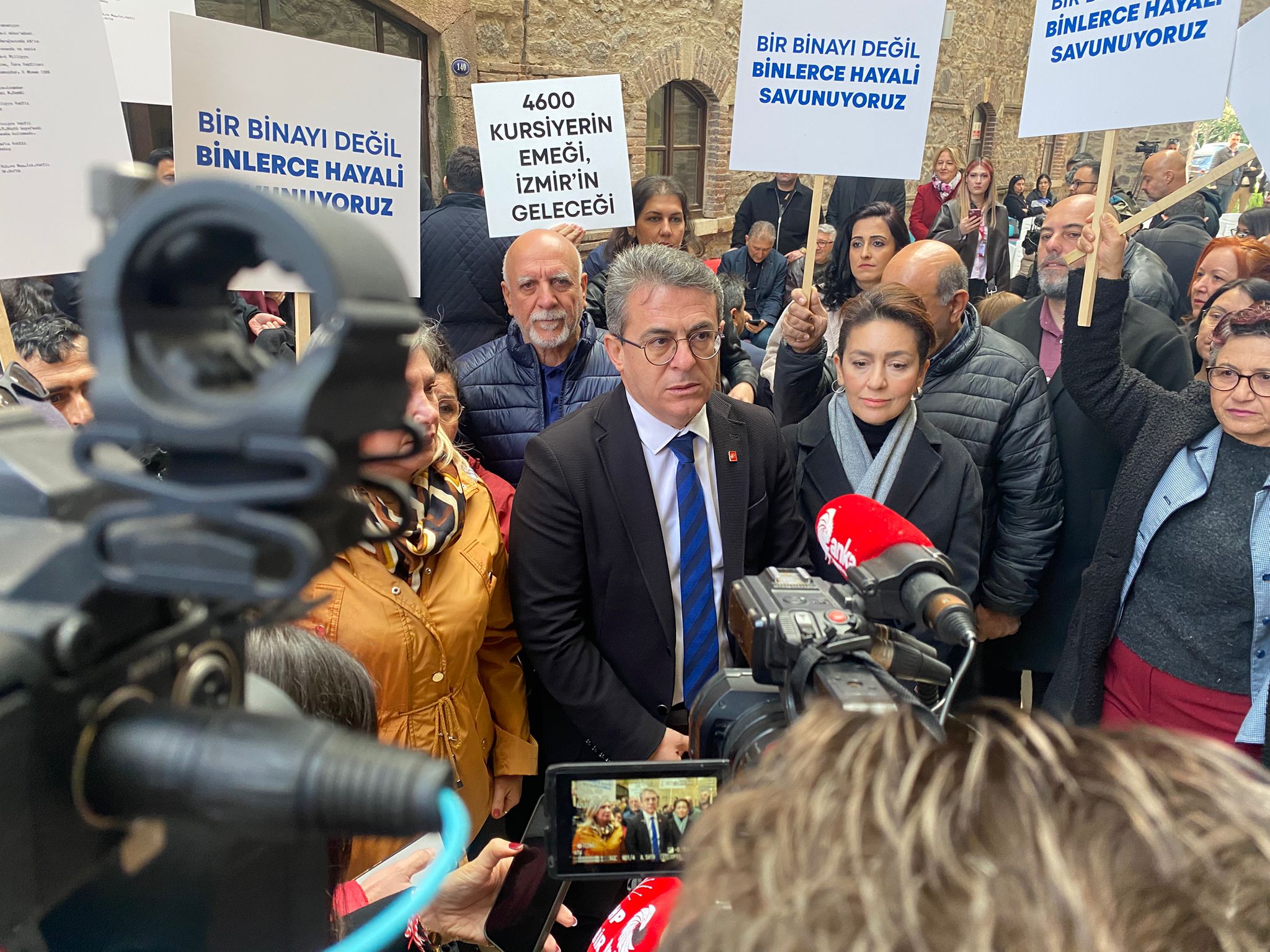 Meslek Fabrikası’nın İzBB kullanımındayken ne için kullanıldığını ifade eden Tugay, “Meslek Fabrikası, vatandaşlarımız bir iş, meslek öğrenip kendisine iş kursun diye kursların düzenlendiği bir binadır. Yüzbinlerce kişiye meslek edindirme kursları verildi. Böylesine bizim için değerli bir iş yapılan, aktif olarak kamusal kullanılan bir bina Vakıfların yapmadığı, hiçbir hakkının hukunun olmadığı, zamanında her hakkında gerekli taraflara ödendiği, Atatürk’ün imzasıyla kamulaştırılmış, İzmir halkının malının olduğuna inandığımız, İzmir Büyükşehir Belediyesi’nin malı olan ama hiç kimsenin kişisel çıkarı olmayan, kamusal hizmet için kullanılan böyle bir binanın zorla hukuksuzca el konulmaya çalışılması kabul edebileceğimiz bir şey değil. Ben, CHP İzmir yöneticileri, bazı belediye başkanlarımız, sendika yöneticilerimiz, Baro başkanımız burada İzmir’e sahip çıkma konusunda gösterdikleri irade için teşekkür ediyorum.” şeklinde konuştu.