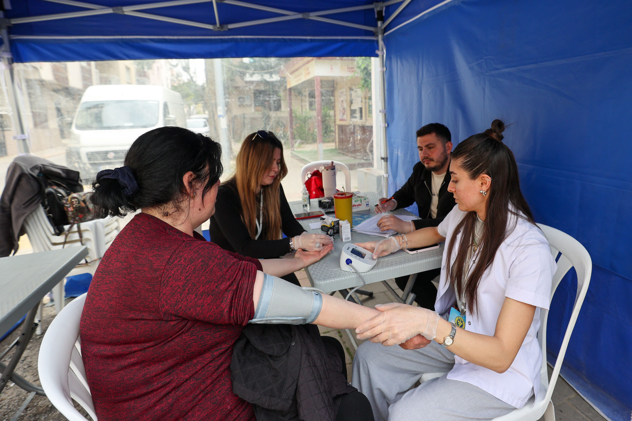 Çalışmaları yerinde inceleyen Buca Belediye Başkanı Görkem Duman, vatandaşlarla sohbet ederek taleplerini dinledi. Başkan Duman da sıraya girerek tansiyonunu ölçtürdü.