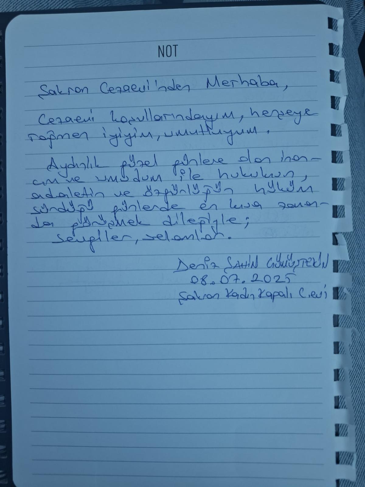 Yeni Şakran Cezaevinde tutuklu olan Genel İş İzmir 8 Nolu Şube Başkanı Deniz Şahin Gümüştekin, el yazısıyla bir mesaj gönderdi. Notta her şeye rağmen iyi ve umutlu olduğunu belirten Gümüştekin, “Adalet ve özgürlüğün hüküm sürdüğü günlerde en kısa zamanda görüşmek dileğiyle” ifadelerini kullandı.