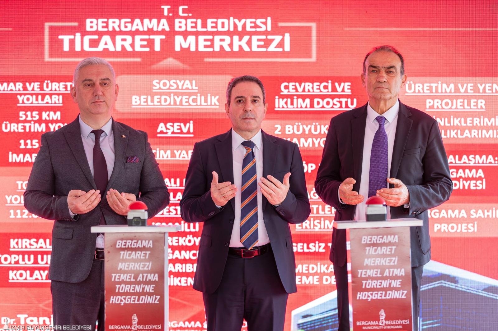 Bergama Belediyesi tarafından kent merkezinde inşa edilecek Bergama Ticaret Merkezi’nin temeli düzenlenen törenle atıldı. UNESCO Dünya Mirası Listesi’nde yer alan Bergama’ya ekonomik ve ticari canlılık kazandırmayı amaçlayan projeye İzmir Büyükşehir Belediyesi Başkan Vekili Dr. Zafer Levent Yıldır, Bergama Belediye Başkanı Prof. Dr. Tanju Çelik, Kınık Belediye Başkanı Sema Bodur, Bergama Kaymakamı Avni Oral ve çok sayıda yurttaş katıldı.