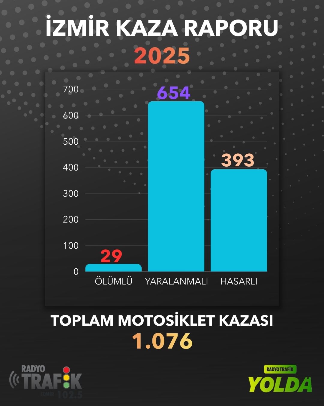 Radyo Trafik İzmir haber merkezine 2025 yılı boyunca binlerce trafik kazası bilgisi ulaştı. Yıllardır İzmir trafiğinin nabzını tutan Radyo Trafik İzmir’in, Radyo Trafik Yolda uygulamasıyla birlikte derlediği istatistiksel veriler, kent genelinde yaşanan kazalara dair çarpıcı sonuçları ortaya koydu. Özellikle motosikletlilerin ve yayaların karıştığı kazalar dikkat çekti.