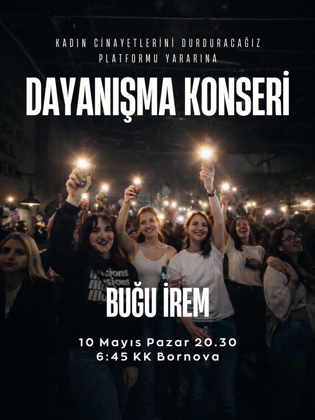 İzmir’de kadın mücadelesine destek olmak amacıyla dayanışma konseri düzenleniyor. Kadın Cinayetlerini Durduracağız Platformu (KCDP) yararına gerçekleştirilecek etkinlik, 10 Mayıs Pazar günü “6:45 KK Bornova” sahnesinde yapılacak. Sanatçı Buğu İrem’in sahne alacağı gecede kapılar saat 20.30’da açılacak, konser ise saat 21.00’de başlayacak.