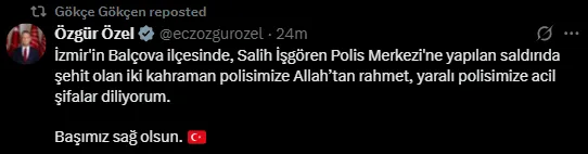 İzmir’de yaşanan acı olay, siyaset dünyasında da yankı buldu. CHP Genel Başkanı Özgür Özel, sosyal medya hesabından yaptığı paylaşımda saldırıya tepki gösterdi ve hayatını kaybeden polisler için başsağlığı diledi.