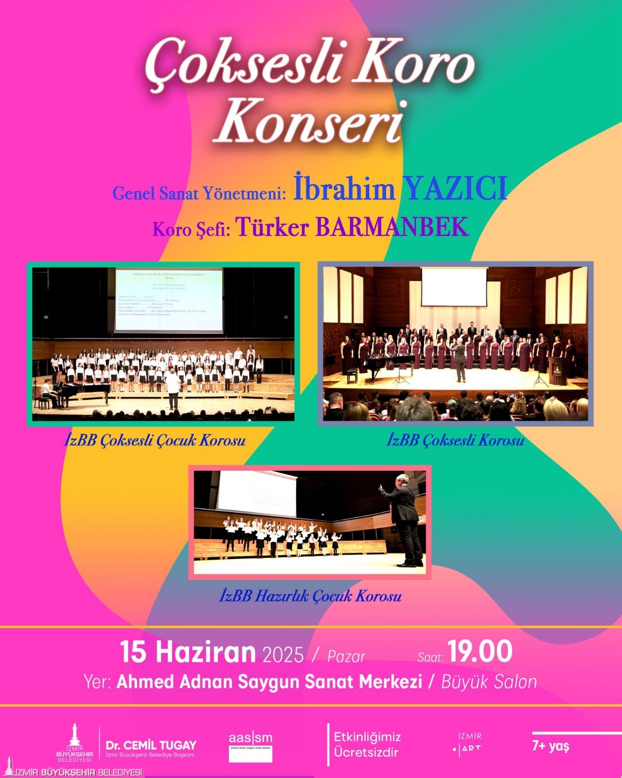 İzmir Büyükşehir Belediyesi bünyesinde kurulan Çoksesli Korosu, Çoksesli Çocuk Korosu ve Hazırlık Çocuk Korosu, 15 Haziran Pazar akşamı saat 19.00’da AASSM Büyük Salon’da ücretsiz olarak seyirciyle buluşuyor. Genel sanat yönetmenliğini İbrahim Yazıcı’nın, koro şefliğini ise Türker Barmanbek’in üstlendiği bu özel konserde, geniş ve renkli bir repertuvar İzmirlileri bekliyor. Sezon boyunca çalışmalarını sürdüren korolar, konserde yıl boyunca yaptıkları çalışmaları sergileyecek.