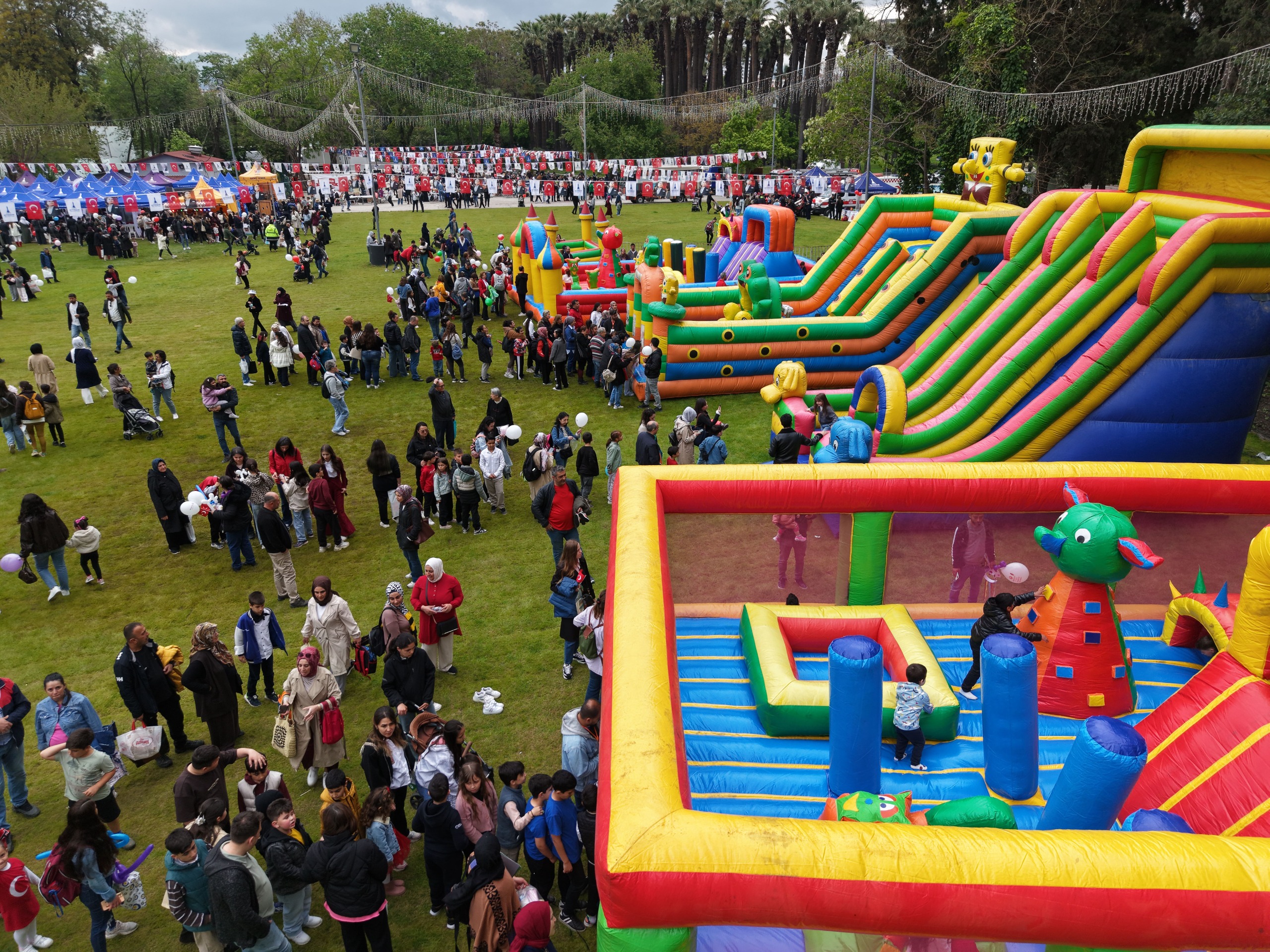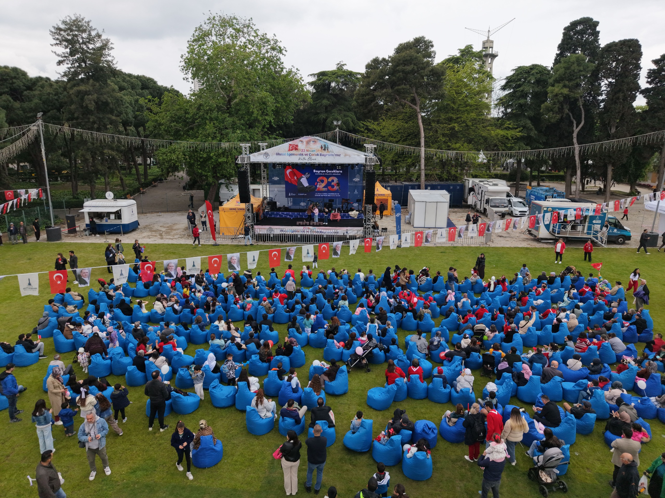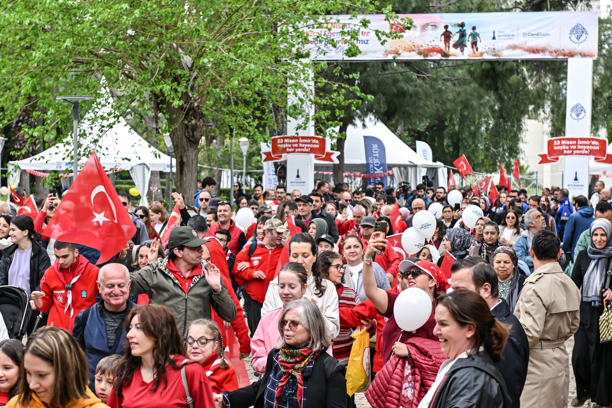 İzmir’de 23 Nisan Ulusal Egemenlik ve Çocuk Bayramı sabahın ilk saatlerinden itibaren coşkuyla kutlanıyor. İzmir Büyükşehir Belediyesi tarafından kentin dört bir yanında düzenlenen etkinlikler, Kültürpark’ta gerçekleştirilen programla taçlandı. Kültürpark’taki kutlamalar, İzmir Büyükşehir Belediye Başkanı Dr. Cemil Tugay’ın katıldığı kortej yürüyüşü ile başladı. Kaskatlı Havuz’dan bando eşliğinde etkinlik alanına kadar süren korteje çocuklar ve aileleri, ellerindeki Türk bayraklarıyla eşlik etti. Başkan Tugay, etkinlik alanına Melek İzciler adlı izci grubundan otizmli Ömercan Anamer ve Osman Türkekul ile birlikte girdi. Çocukların yoğun ilgisiyle karşılanan Tugay, kurulan stantları gezerek çocuklarla sık sık fotoğraf çektirdi.