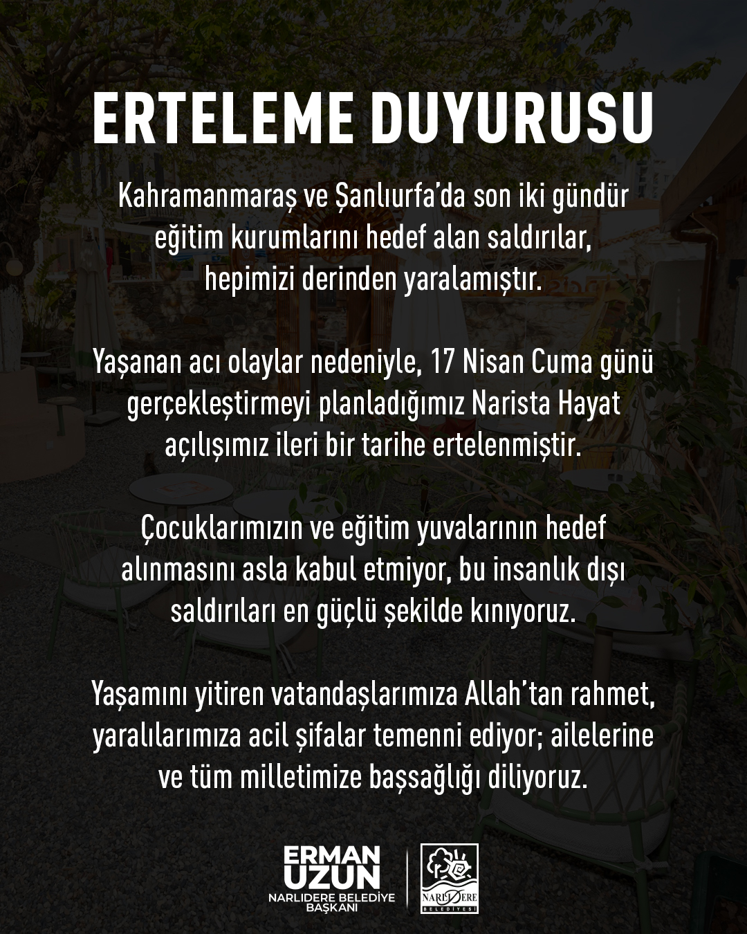 Narlıdere Belediyesi, Şanlıurfa ve Kahramanmaraş’taki okul saldırıları nedeniyle Narista Hayat açılışını ileri bir tarihe erteledi.