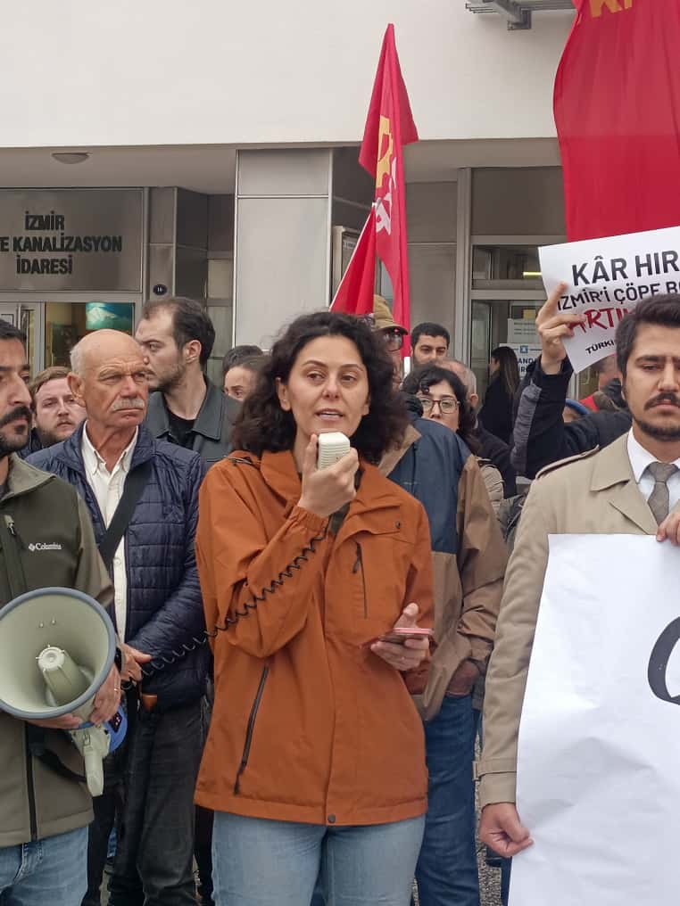 Eylemde TKP İzmir İl Başkanı Tuğçe Sezen Gedik söz aldı. Sözkonusu özelleştirmenin kamu hizmetinin pahalanması, kalitesinin düşmesi, denetiminin gevşemesi ve emekçiler için sendikasız, güvencesiz, düşük ücretlere çalışmak anlamına geleceğini ifade eden Gedik, “Plansızlık içinde ‘yönetilmeye’ çalışılan şehrimiz çok önemli bir çöp sorunu ile boğuşuyor, ortaya çıkan halk sağlığı sorunları hepimizi endişelendiriyor. İzmir Büyükşehir Belediye Başkanı Cemil Tugay, bu özelleştirme hamlesiyle yeni bir halk sağlığı sorunu yaratmaktadır. Görünen o ki, Cemil Tugay’ın kendisi İzmir için bir halk sağlığı sorunu hâline gelmiştir. Halkın kaynaklarını patronlara peşkeş çekemezsiniz, endesindeyiz!” diye konuştu.